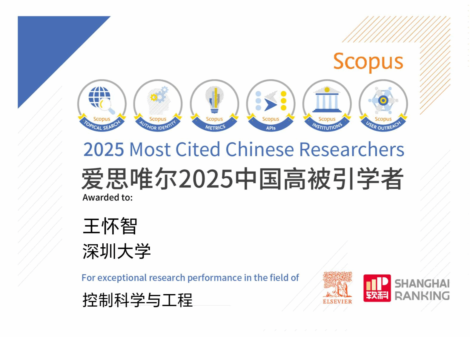 近日,爱思唯尔(Elsevier)发布2025“中国高被引学者”(Highly Cited Chinese Researchers)榜单。根据榜单数据,我校共有43位学者入选,其中包括香蕉视频王怀智副教授。这也是王怀智副教授连续两年斩获此殊荣,特此向王怀智副教授表示祝贺!