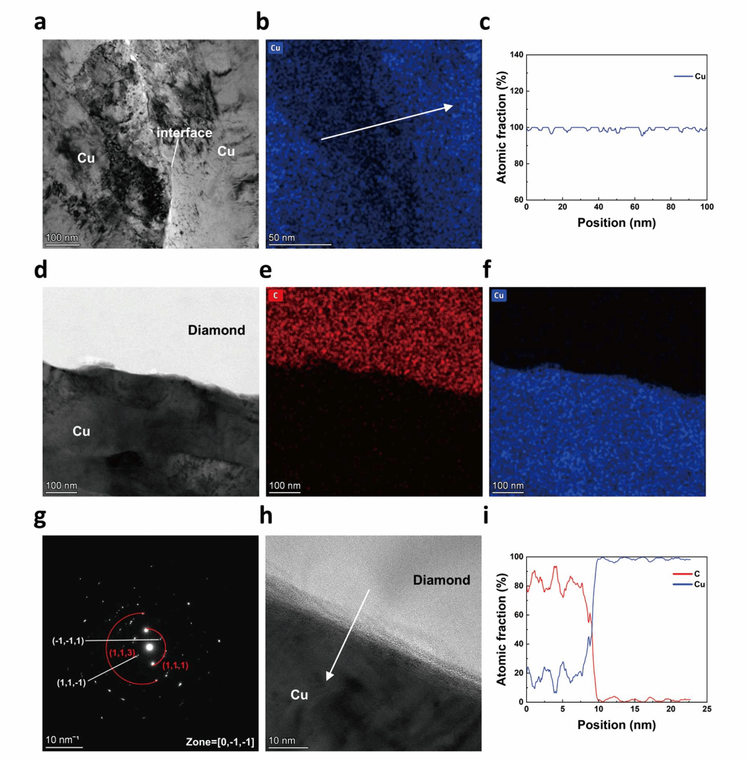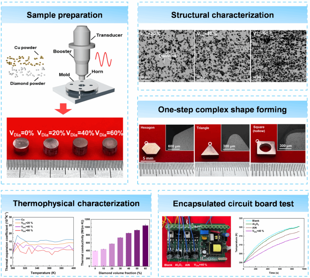马将教授团队提出了一种一步成型、无热源的冷制造方法,在室温和16MPa的低压下通过超声振动在几秒钟内制备了铜/金刚石复合材料。相比于常用的高温高压烧结(HTHP)方法,此方法压力降低200–500倍,温度仅为传统方法的20%。借助此技术,实现了铜颗粒界面之间的直接冶金结合和金刚石在铜基体中的固体嵌入,赋予复合材料150MPa的高屈服强度和超过1043W/(mK)的高热导率。此外,通过该方法可以很容易制造出不同复杂形状的铜/金刚石复合材料。散热应用测试表明,其热管理性能优于商用的Al2O3和AlN材料。