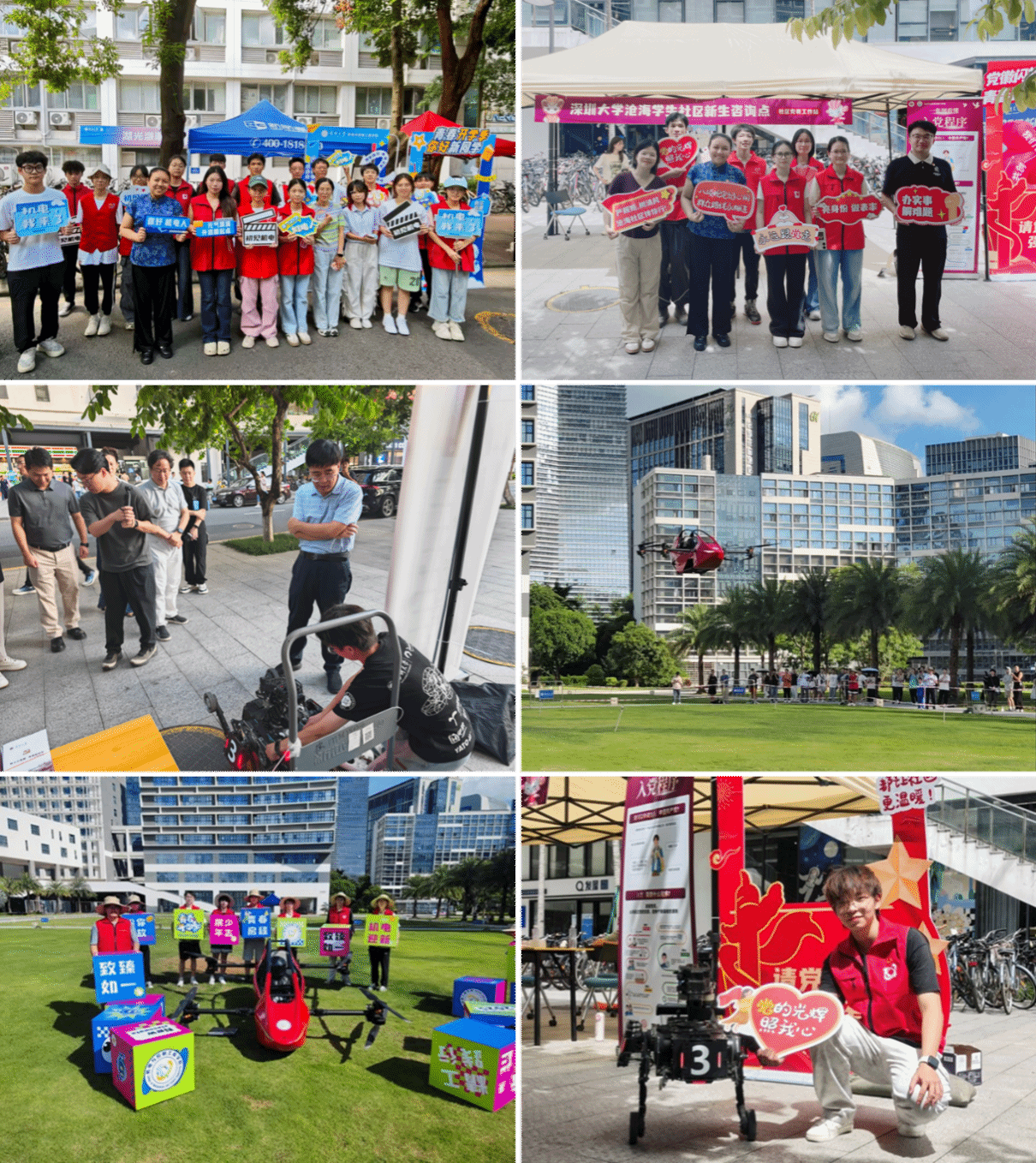 此外,学院组织了具有学科特色的迎新活动。由学院与深圳市英武智能科技有限公司共同研发的轻型载人飞行器在桑田广场大草坪腾空飞行,为新生们带来充满科技感的迎新体验;RobotPilots俱乐部的队员们操控着自主研发的机器人为新生搬运行李,在路上向新生们介绍着机器人的运作原理……这些充满科技感的迎新活动让新生们近距离感受学院的学科特色和魅力,激发科研兴趣。活动获得了深圳报业、深视新闻、第一现场等多家媒体报道。