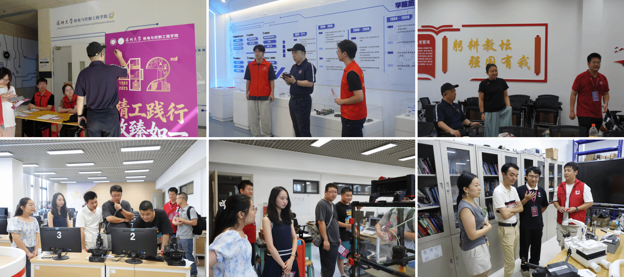 校友们从四面八方重返母校,在签到处留下重逢的笑颜与珍贵合影。沿着精心规划的路线,校友们首先参观了智造长廊,重温学院发展历程与科技创新足迹;在工程训练中心,学院新建设的金工实习设备和车间让校友们感慨于学院发展速度之快。校友们还参观了学院机甲大师实验室、智能车俱乐部和AutoLeaders俱乐部等学生双创俱乐部。在数智工匠练功坊,校友们参观了学院老师自主设计研发的桌面级数控机床PPCNC以及教学实训平台,深入了解学院在工程人才培养的创新实践与前沿探索。