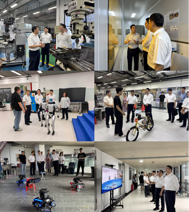 调研组先后走访了“智造长廊”党建会客厅、科研共享平台、工程训练中心、半导体制造研究院、深圳电磁控制重点实验室、智能车俱乐部、具身智能俱乐部、RobotPilots机器人实验室、无人机试飞平台等党建阵地及科研备赛场地,详细了解学院党建引领“一融双高”的实践成果。学院党委书记郑纯介绍了以“科创社团党支部”“臻工创新党支部”为代表的特色党建模式,通过“党建+双创/科研”深度融合,坚持党建引领、双创淬炼、社会服务、标杆示范“四轮驱动”,培养了一批“又红又专”的卓越工程师。