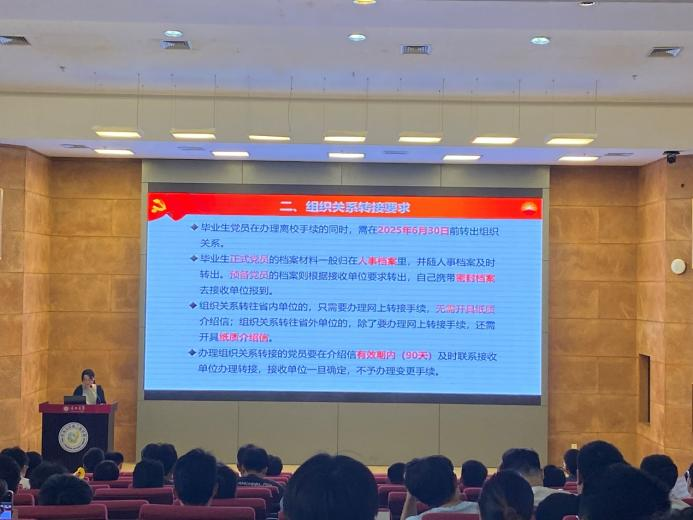随后,学院党建组织员吴俊敏老师详细阐述了毕业生党员档案及组织关系转接工作的重要性,并围绕组织关系转接落地的要求、方式、流程及注意事项等关键内容进行了全面介绍,为毕业生党员提供了清晰、实用的指引。