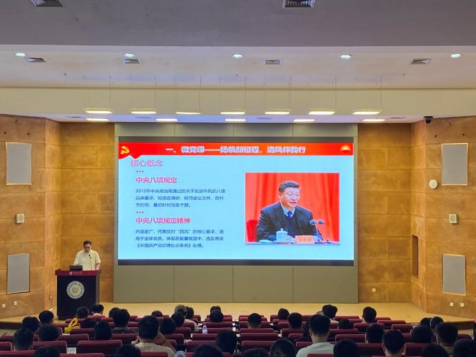 会议伊始,研究生第二党支部副书记谢智权老师讲授微党课。他深入剖析了党章党规党纪学习教育在党性教育中的关键作用,强调党员必须划清行为红线底线,防止不良影响侵蚀职业生涯,扣好廉洁从业的“第一粒扣子”。他要求党员同志严格遵守中央八项规定精神,坚决抵制“四风”,在工作中始终做到求真务实、艰苦奋斗、廉洁奉公,为投身中国式现代化建设筑牢根基。谢智权老师特别提醒初入职场的党员要力戒追求排场、工作浮于表面等不良倾向,严守各项规定,树立良好形象。他强调,优良作风是紧密联系群众的纽带,全体党员务必做到勤俭节约、深入实际、服务群众、踏实肯干。